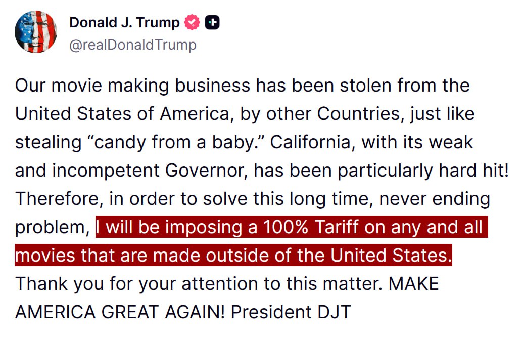 Former President Donald Trump announced plans to impose a 100% tariff on "any and all" movies produced outside the United States. This decision is part of his effort to reclaim Hollywood, which he claims has been "stolen" by foreign countries.