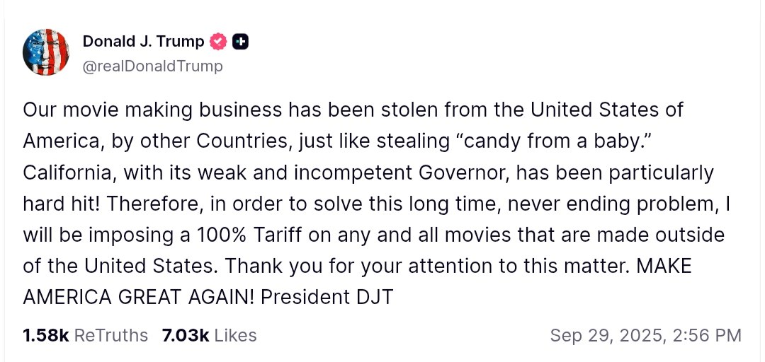 US President Donald Trump announced plans to impose a 100% tariff on "any and all" movies made outside the United States. This decision is part of an effort to reclaim Hollywood, which Trump claims has been "stolen" by foreign countries.