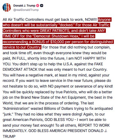Former President Donald Trump announced that he will recommend a bonus of $10,000 for each air traffic controller who did not take any time off during what he referred to as the "Democrat Shutdown Hoax." This statement was made recently as part of his ongoing commentary on government operations.