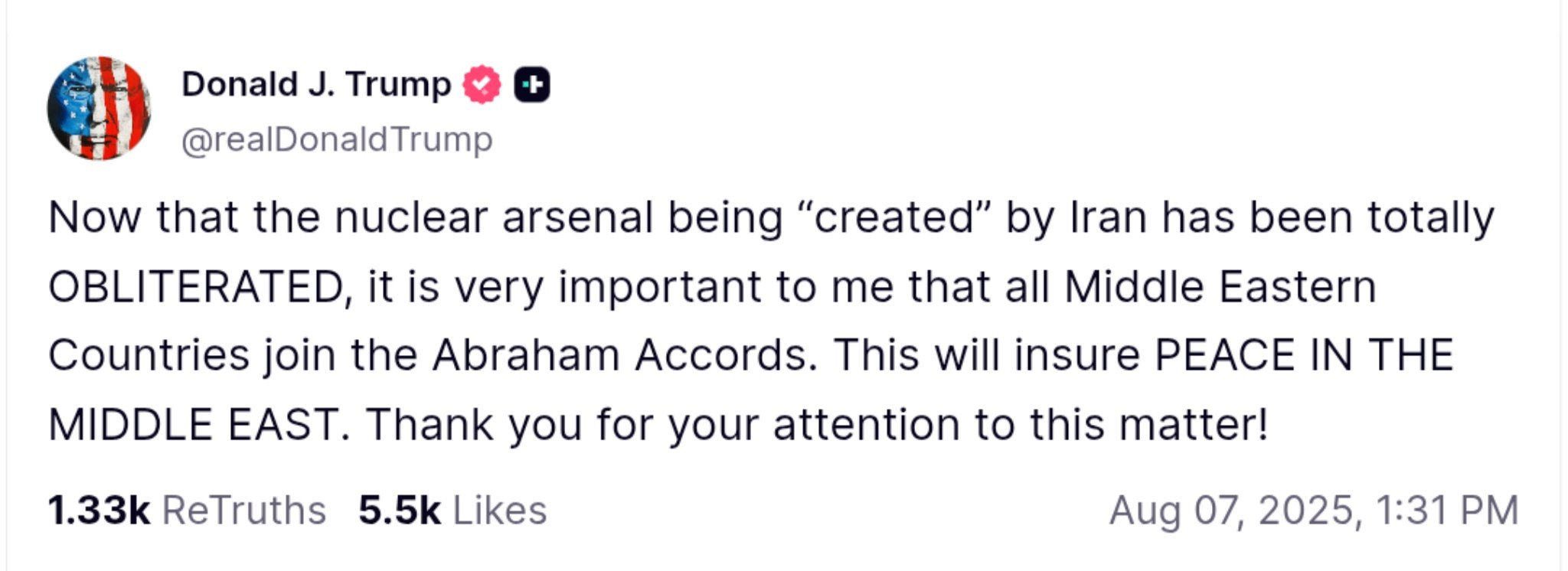In his message, Trump stated, "Now that the nuclear arsenal being "created" by Iran has been totally OBLITERATED, it is very important to me that all Middle Eastern Countries join the Abraham Accords." The emphasis on peace and collaboration among Middle Eastern nations reflects Trump"s strategic vision for the region. By advocating for broader participation in the Accords, Trump aims to build a coalition that could counterbalance Iran"s influence and enhance security for Israel and its neighbors.