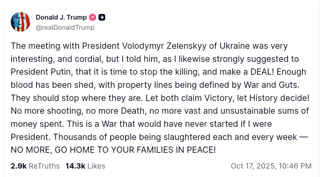 Trump called for an end to the violence, stating, "No more shooting, no more Death, no more vast and unsustainable sums of money spent." He claimed that the ongoing conflict would not have started if he were President and highlighted the ongoing loss of life, saying, "Thousands of people being slaughtered each and every week — NO MORE, GO HOME TO YOUR FAMILIES IN PEACE!"