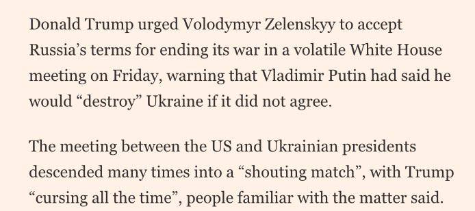 Former U.S. President Donald Trump has urged Ukrainian President Volodymyr Zelenskyy to accept Russia"s terms to end the ongoing war. Trump warned that if Zelenskyy refuses, Russian President Vladimir Putin would "destroy" Ukraine. This statement was reported by the Financial Times.