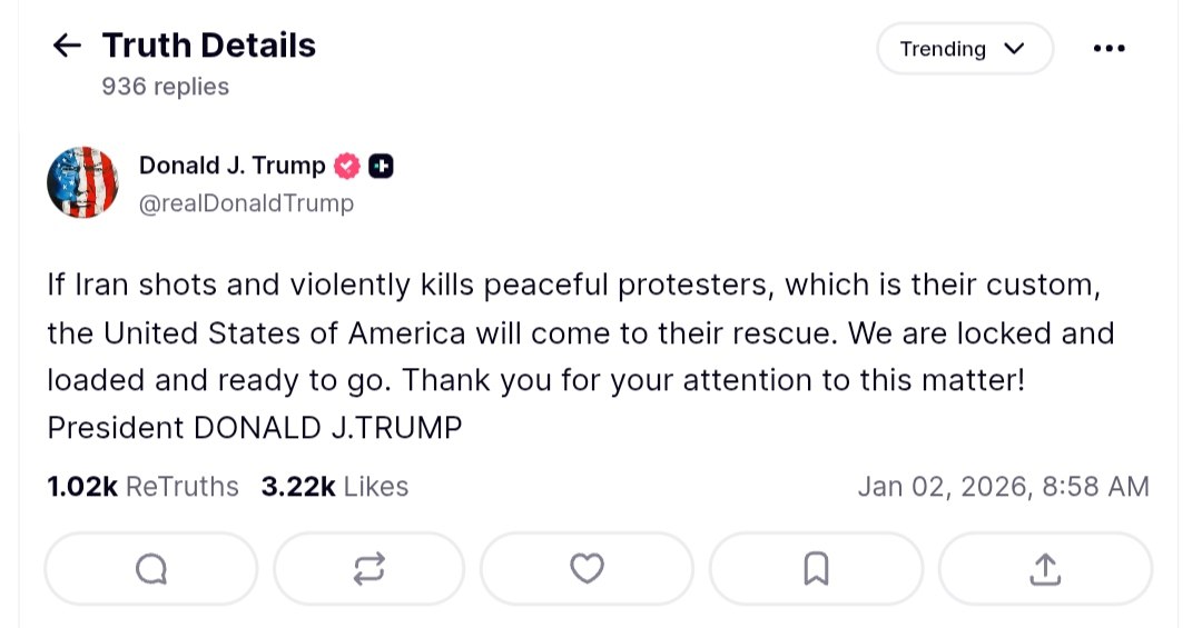 US President Donald Trump issued a warning regarding Iran"s treatment of protesters on January 2, 2026. He stated, "If Iran shots and violently kills peaceful protesters, which is their custom, the United States of America will come to their rescue. We are locked and loaded and ready to go."