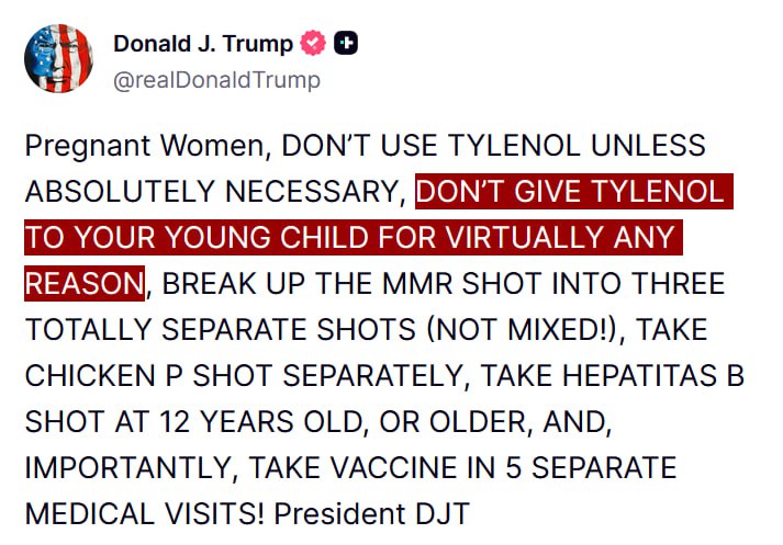Former President Donald Trump has issued a warning to pregnant women regarding the use of Tylenol for young children. In a post on Truth Social, Trump stated, "DON’T GIVE TYLENOL TO YOUR YOUNG CHILD FOR VIRTUALLY ANY REASON."