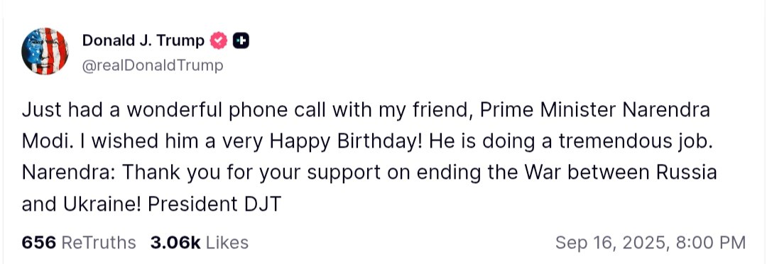 US President Donald Trump announced that he had a phone call with Indian Prime Minister Narendra Modi on September 16, 2025. During the call, Trump wished Modi a happy birthday and praised his leadership, stating that he is doing a tremendous job.