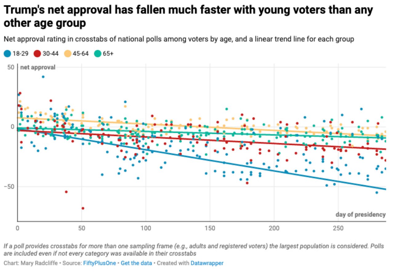 The collapse in approval ratings reflects a broader shift in public opinion, particularly among younger voters, who have historically played a crucial role in elections. The decline may impact Trump"s support in future electoral contests.