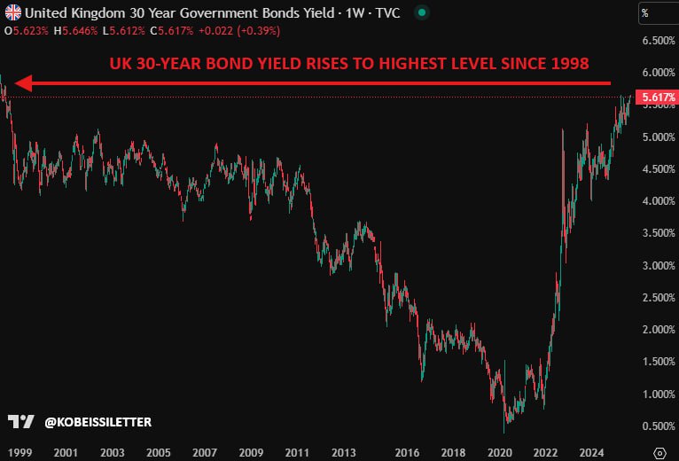 The yield on a 30-year bond in the UK surged to 5.64% today, marking its highest level since 1998. This dramatic rise reflects the UK"s deteriorating fiscal situation, as yields are now 15 times higher than the historic lows seen in 2020.
