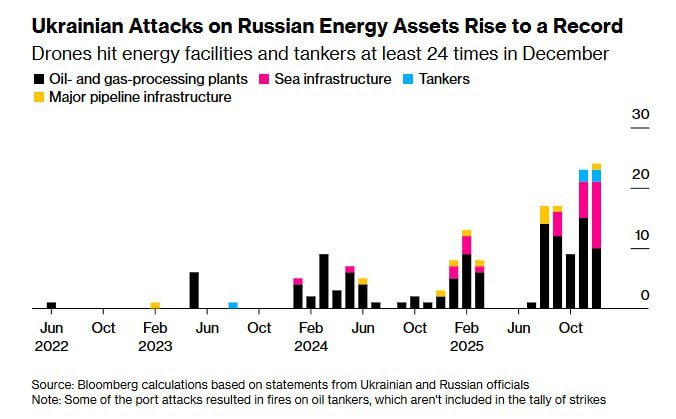 Ukraine conducted 24 strikes on Russian energy infrastructure in December 2025, marking the highest monthly total since the onset of the war, according to Bloomberg. The attacks targeted various facilities, including refineries, pipelines, tankers, ports, and offshore fields.