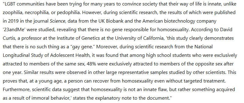 The draft law cites studies that claim homosexuality can be "corrected" and suggests it is not an innate trait but rather acquired through "immoral behavior." It proposes fines for individuals and entities found in violation of its provisions.