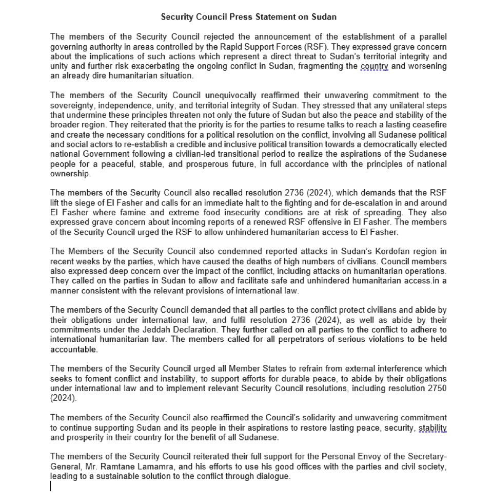 #BREAKING | The United Nations Security Council has officially rejected the establishment of a parallel government led by the Rapid Support Forces (RSF) in Sudan. This comes amid increasing tensions and violence in the country, as the RSF continues to impose a siege on the city of El Fasher, causing severe humanitarian concerns.