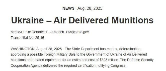 The U.S. State Department has approved an $825 million arms package to Ukraine, providing the country with 3,350 ERAM air-launched missiles. This significant deal, announced today, also includes advanced GPS/INS systems equipped with SAASM modules and a range of related equipment.