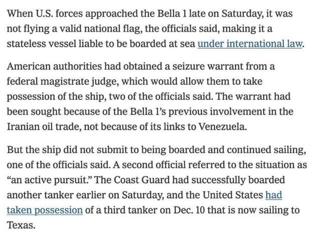 The Bella 1 was reportedly en route to Venezuela to pick up oil and was not carrying any cargo at the time of the Coast Guard"s approach. According to ship-tracking data and statements from three U.S. officials who requested anonymity due to the sensitive nature of the operation, the vessel has been under U.S. sanctions since 2024 for its involvement in transporting Iranian oil. U.S. authorities contend that the sale of this oil is used to finance terrorism.