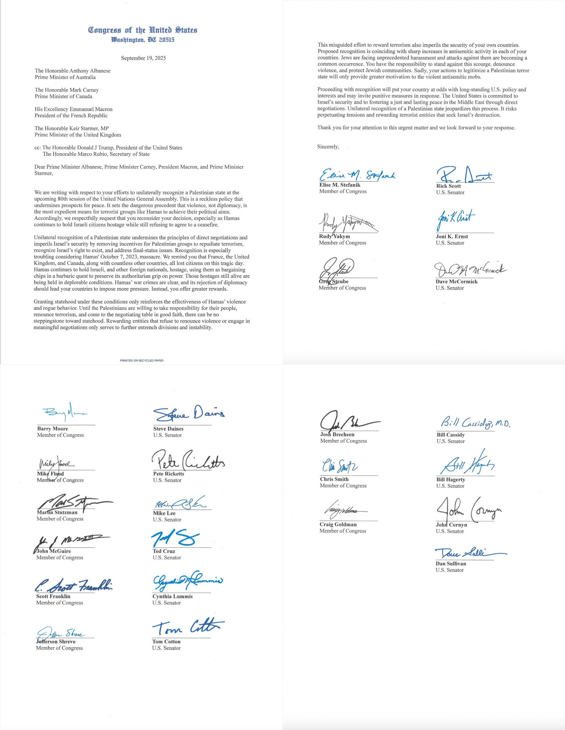 U.S. Congress members have sent a letter to France, Canada, the United Kingdom, and Australia urging them to reject unilateral recognition of a Palestinian state at the United Nations General Assembly. This action reflects ongoing concerns regarding the recognition of Palestinian statehood in international forums.