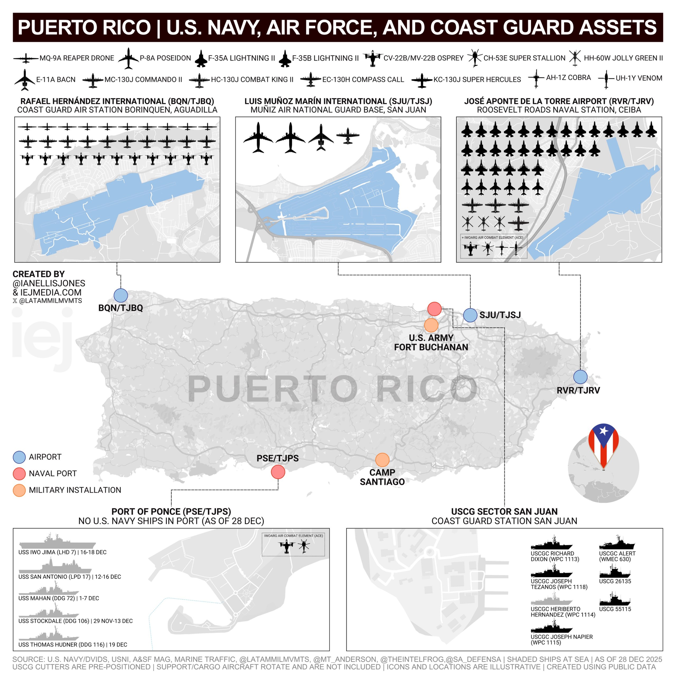 Specific operational roles for the deployed assets include the following: the Rafael Hernández Airport (BQN) will serve as a hub for special operations and drone activities; the José Aponte de la Torre Airport (RVR) will host strike assets and support the Integrated Air and Missile Defense (IWOARG ACE); the Luis Muñoz Marín International Airport (SJU) will focus on command and control (C2), intelligence, surveillance, and reconnaissance (ISR), and electronic warfare (EW); while the Ponce Airport (PSE) will facilitate operations for the Navy and U.S. Marine Corps.