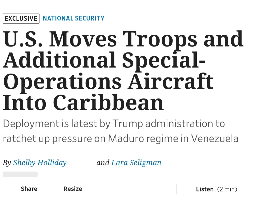 On December 23, 2025, the United States has moved troops and additional special-operations aircraft into the Caribbean. This deployment is part of the Trump administration"s ongoing efforts to increase pressure on the Maduro regime in Venezuela, according to a report by the Wall Street Journal.