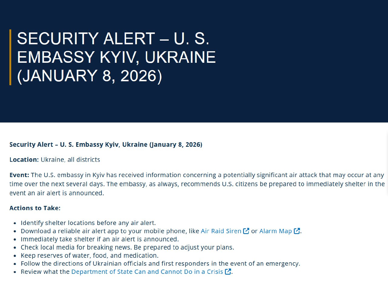 The U.S. Embassy in Kyiv has issued a security alert regarding a potential air attack. The alert warns that "a potentially significant air attack may occur at any time over the next several days." This notification was made public on January 8, 2026.