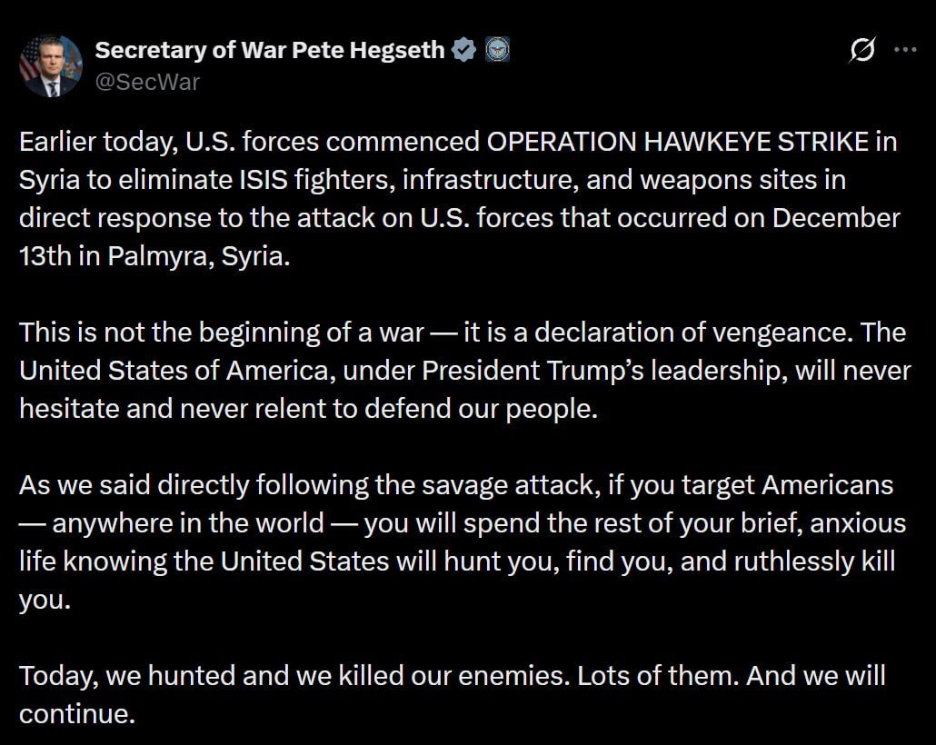 On December 19, 2025, U.S. Secretary of War Pete Hegseth announced the initiation of OPERATION HAWKEYE STRIKE in Syria. This military operation aims to eliminate ISIS fighters, their infrastructure, and weapons sites. The operation is a direct response to an attack on U.S. forces that occurred on December 13, 2025, in Palmyra, Syria. Hegseth emphasized that this action is not the beginning of a war but rather a declaration of vengeance against those who threaten American lives.