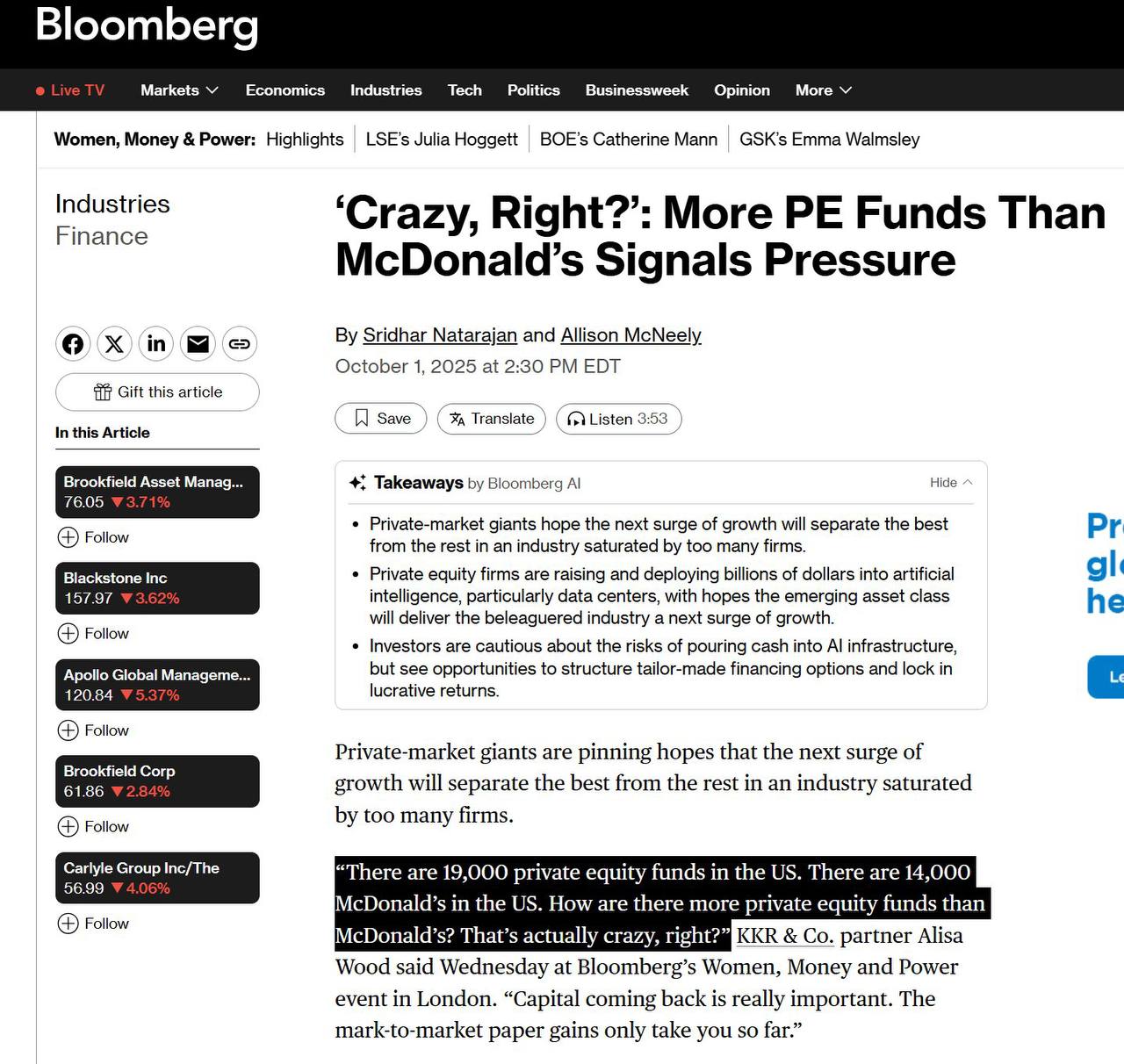 The United States has more private equity funds than fast-food restaurants, with a reported 19,000 private equity funds compared to 14,000 McDonald"s locations. This statistic highlights the financialization of the U.S. economy, which is characterized by a focus on financial rent-seeking rather than innovation or manufacturing.