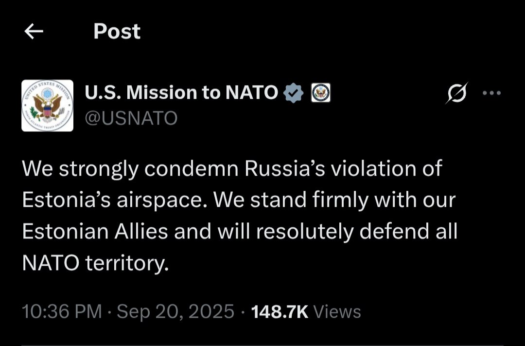The U.S. Mission to NATO has condemned Russia for violating Estonia"s airspace. In a statement, the mission expressed strong support for Estonia, affirming its commitment to defend all NATO territory. The incident highlights ongoing tensions between Russia and NATO member states.