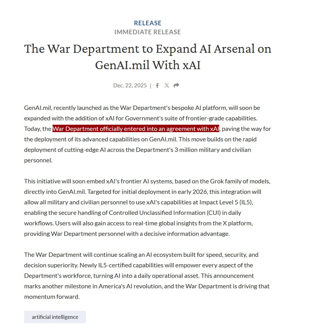 On December 22, 2025, the U.S. Pentagon announced that it has officially entered into an agreement with xAI. This partnership aims to enhance the rapid deployment of advanced artificial intelligence technologies across the Department of Defense, which includes approximately 3 million military and civilian personnel.