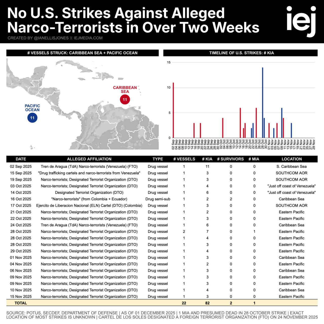 The United States has not conducted any strikes against alleged narco-terrorists for over two weeks, marking the longest period of inactivity since operations began in early September. This lull in military action comes three months into the campaign.