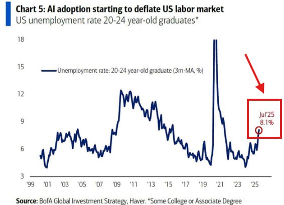 The unemployment rate for youth graduates aged 20-24 in the United States has reached 8.1% over the last three months, marking the highest level in four years. This statistic reflects a significant increase from under 4% just two years ago, coinciding with the onset of the AI boom.