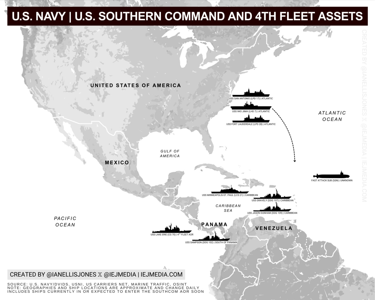 In addition to the Iwo Jima, the USS Lake Erie (CG 70), a guided-missile cruiser, is currently active in the U.S. 4th Fleet. Meanwhile, the USS Gravely (DDG 107), USS Jason Dunham (DDG 109), and USS Minneapolis-St. Paul (LCS 21) are stationed in the Caribbean, with the USS Sampson (DDG 102) positioned south of Panama. Several unidentified fast-attack submarines have also been reported operating off the east coast throughout August.