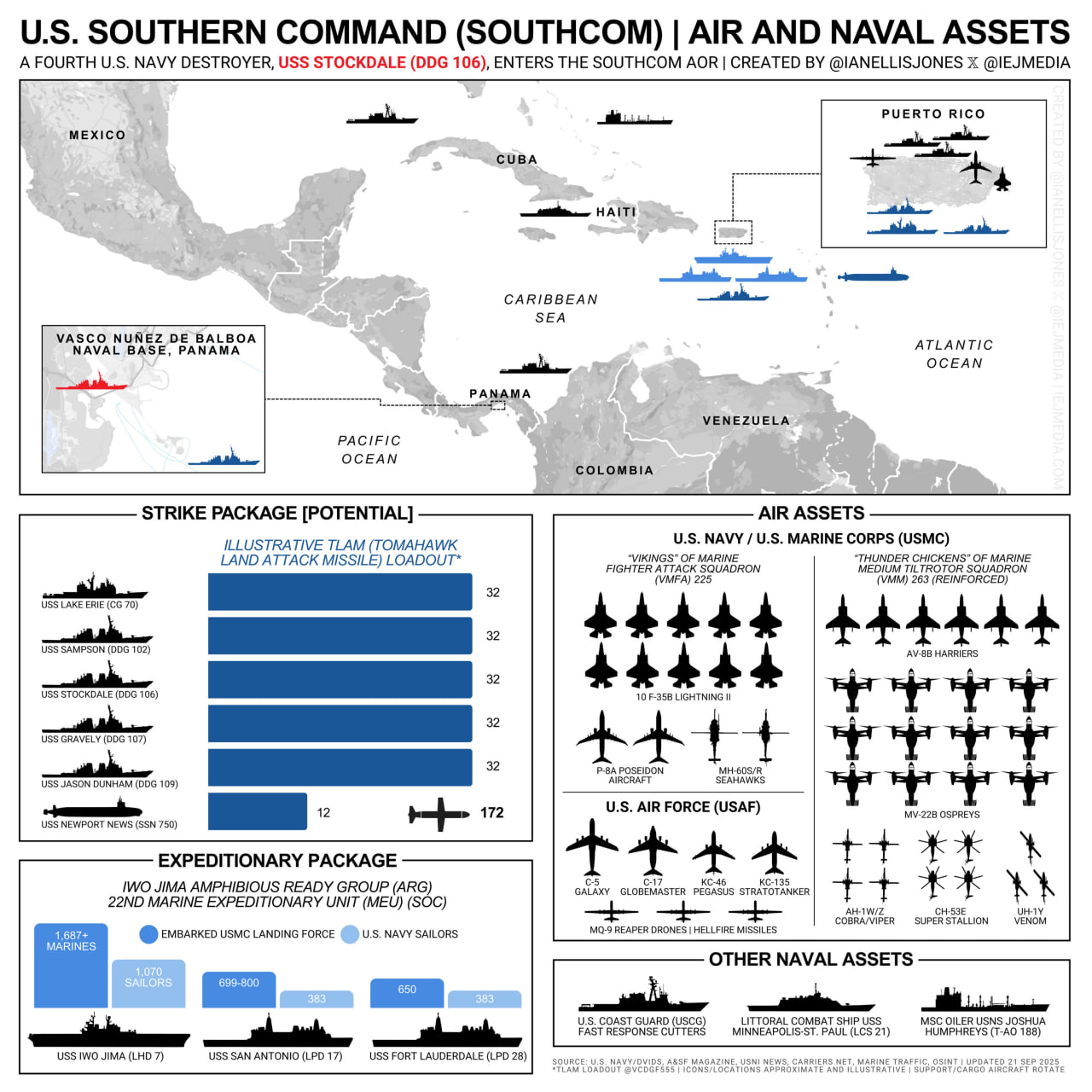 The USS Stockdale (DDG 106) arrived in Panama on September 21, 2025, marking the deployment of the fourth guided-missile destroyer in the U.S. Southern Command area of responsibility. This deployment increases the number of U.S. Navy warships in the region to at least ten, which constitutes approximately 13% of the ships currently deployed by the Navy.