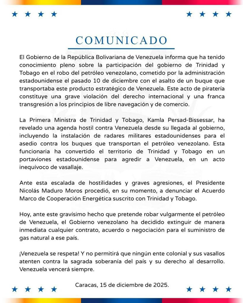 On December 15, 2025, the Venezuelan government, led by President Nicolás Maduro, announced the immediate termination of all contracts and negotiations related to the supply of natural gas to Trinidad and Tobago. This decision comes in response to accusations against the Trinidadian government for its alleged involvement in the seizure of a Venezuelan oil tanker, an incident that Maduro"s administration describes as an act of piracy and a violation of international law.