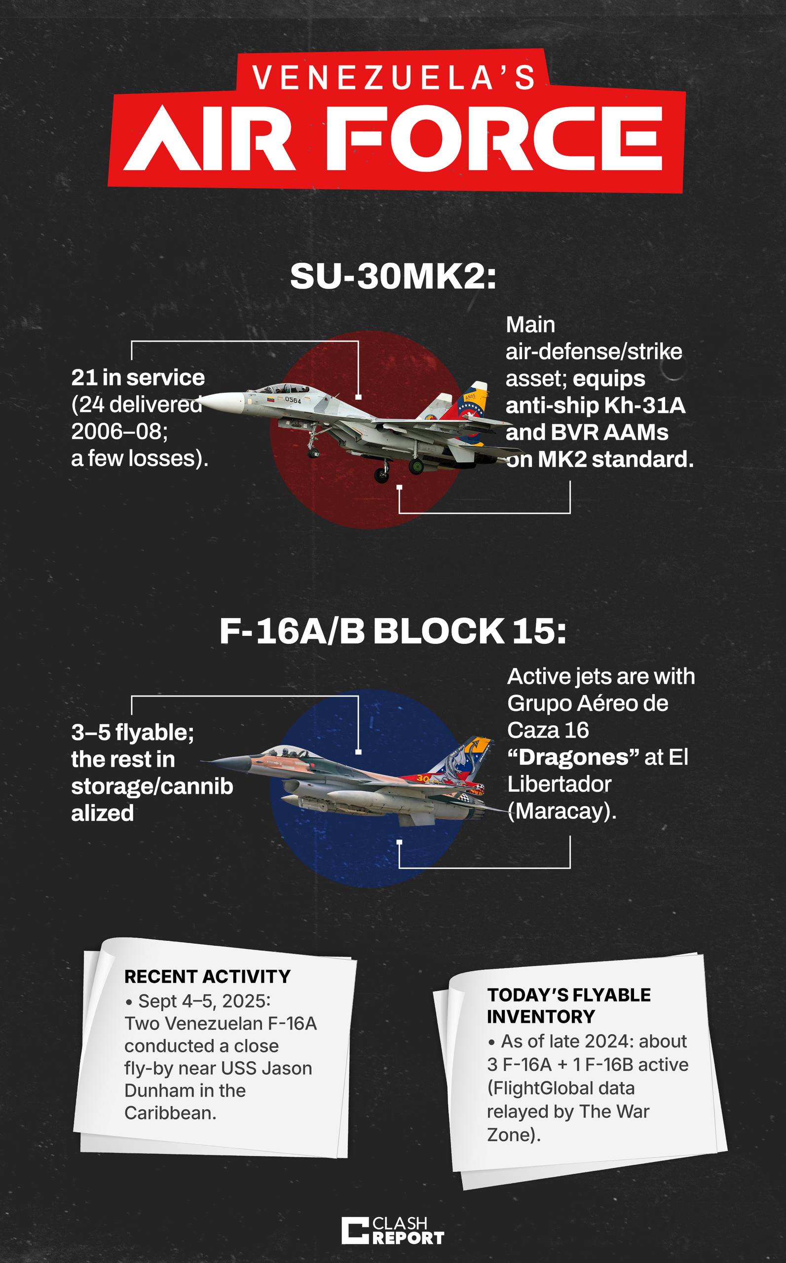 The Venezuelan Air Force is increasingly reliant on its fleet of Su-30MK2 fighter jets, with 21 units currently in service, as the operational status of its F-16A/B Block 15 aircraft dwindles. Only three to five of the F-16s remain flyable, while the majority are in storage or have been cannibalized for parts.