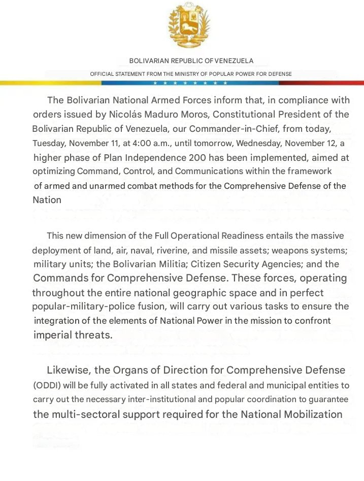The Venezuelan Armed Forces have commenced the intensive phase of Plan Independence 200 military exercises starting today, November 11, 2025. This development coincides with the arrival of the USS Ford aircraft carrier strike group in the Southern Command (SOUTHCOM) region.